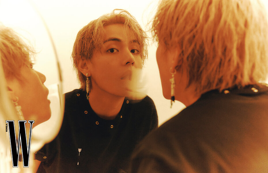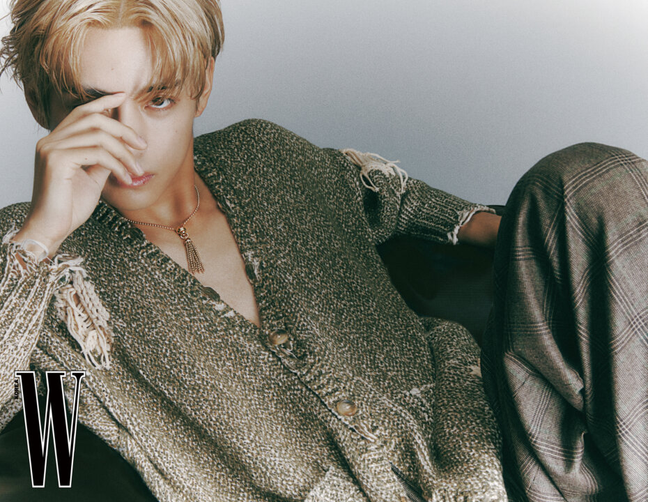 Be it the entrancing glimmer in his gaze, the captivating grace of his fingers, or the elegant contour of his silhouette, W Korea captured each essence of V through the lens. As the sun descended casting its gentle hues, ‘In these days, happiness flourishes and joy fills.’ V casually imparted.’